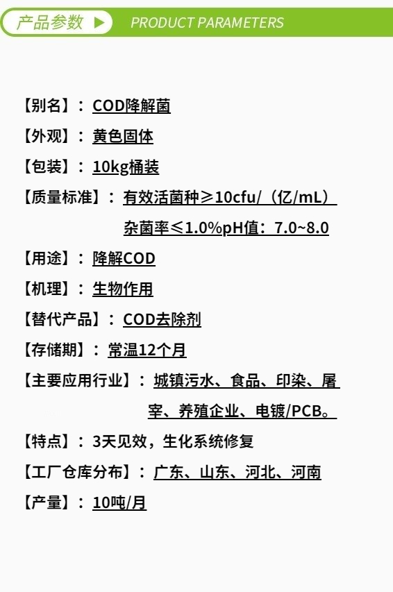 庫巴魯®COD激活菌301是針對生化系統中COD專門研發的高效COD去除菌,能降解廢水中的蛋白質、淀粉、纖維素、糖類、油脂等碳氫化合物,提升優勢菌群,有效抑制病原性微生物的繁殖。推薦閱讀:滲濾液COD去除劑—清源牌