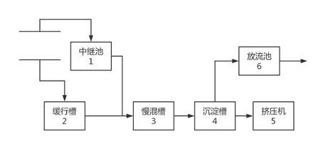 化學沉淀法除氟技術是工程上常用的工藝之一,脫硫廢水經中繼池和緩行槽后依次進入慢混槽和沉淀槽,由沉淀槽排除沉淀污泥進入擠壓機處理,分流處理液引入放流池后外排。